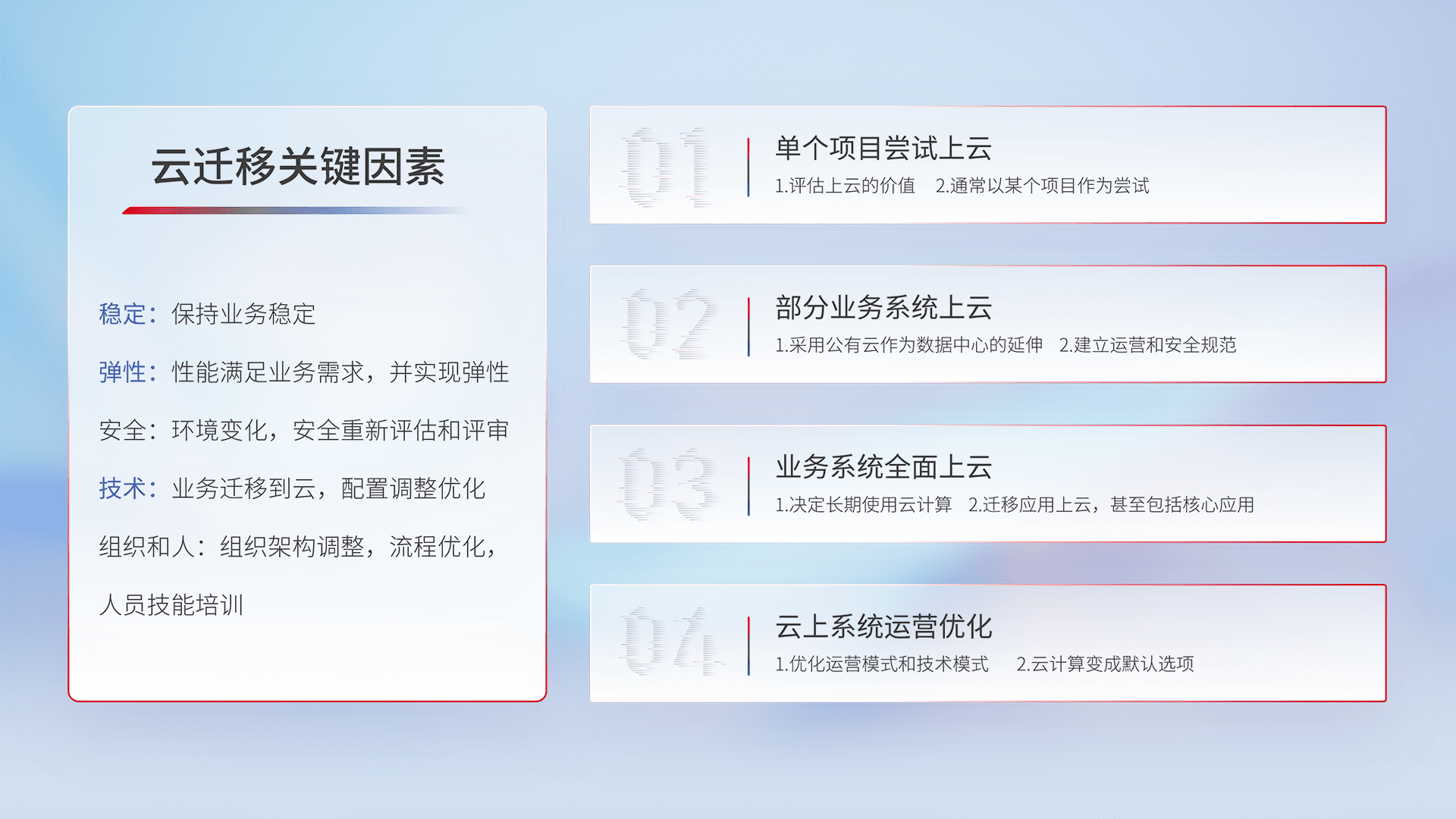 结合实际业务,,从规划设计、、、云平台选型、、、云原生改造、、、数据迁移、、、集成交付,,迁移全过程为客户识别最佳上云路径,,,,做好风险识别管理,,,,设计网络架构、、、身份权限、、、、安全审计合规、、操作审计、、日志审计、、、、监控告警策略、、、、多站点容灾设计等,,,,对云上基础设施进行整体规划,,,,提升IT治理水平,,以满足弹性、、、高可用、、、高性能的需求。。。。